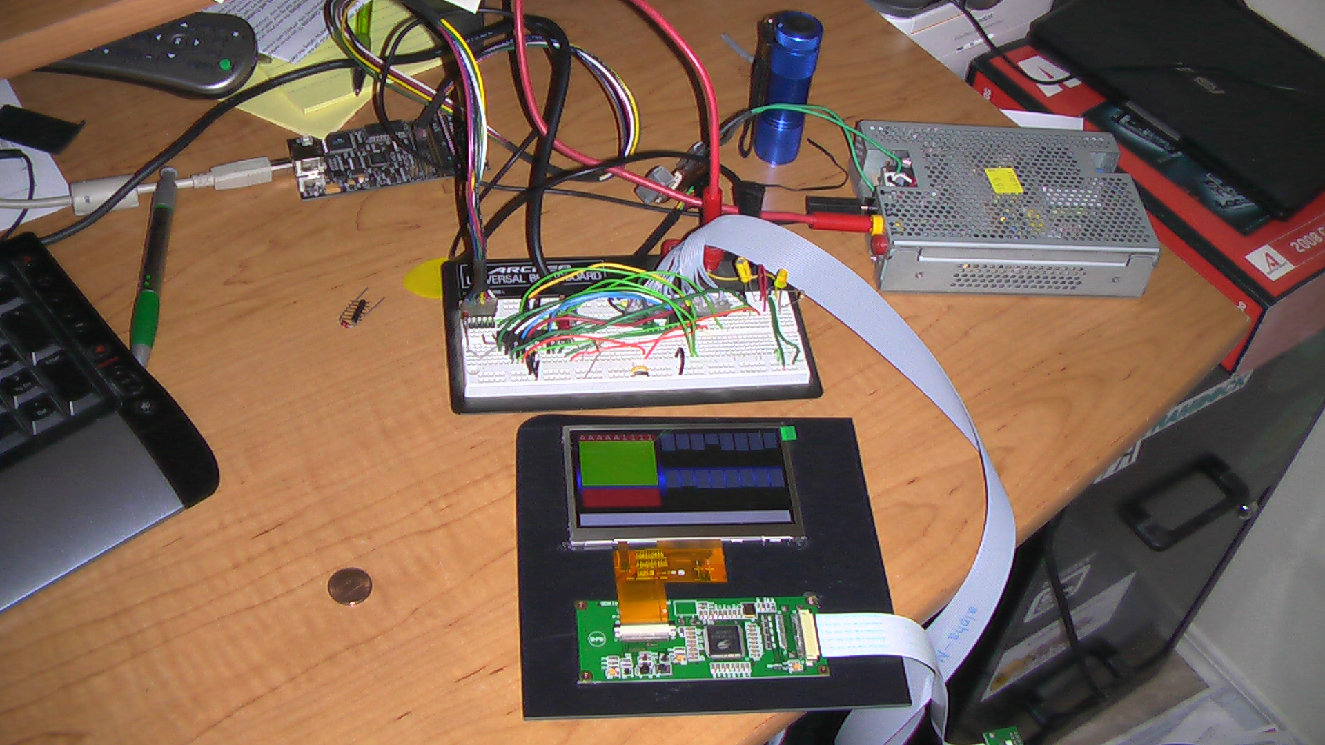 I have a few ATMega88A micros laying around and slapped one of those on the board to get something running. The SDD1963 controller makes it really easy to interface a micro with the LCD. There are only 8 data lines, 3 supply lines and 6 control lines. The ATMega88 has a full byte wide I/O port and a few partial I/O ports, so wiring the LCD up was no problem. For the curious, I used PortB for the data and PortC for the control lines, with a single line on bit 4 of PortD. Now with the setup done time for the software. Take a look at the setup, below