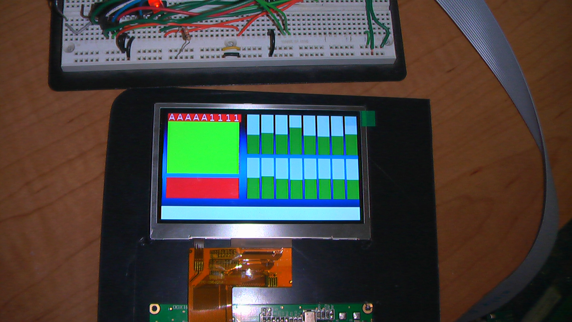 I use Ubuntu at home for my development and chose the ATMega because there is support in the GCC for the AVR and also support for the AVR Dragon programmer via avrdude. Just a note, I had problems with the version of avrdude that is for Ubuntu 9.10 so I use version 5.5. The setup of the LCD was easier than I thought, due to the app notes and code posted on the New Haven Display site. I used the config for the 5.7 inch display as a base and tweaked the command values to match the 480×272 size of the 4.3 inch. There are 16 batteries in the car I want to use this in, thus I need a way to show 16 values quickly. I played around with window drawing and make a simple bar graph function to show percentages on the display at arbitrary locations. The last thing I did was try and create text values on the screen. The reason I stopped here is the ATMega only has 8k flash and 1k RAM and I was hitting a memory limit when I tried to compile more than 2 letters. You can see the fruits of my labor in the picture below