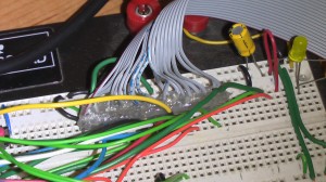 A few days ago the stuff from New Haven Display got here and this weekend I wired it all up. The first task was to get the LCD wired into my breadboard. Items you need for this are 20-pin ribbon cable, a female connector, 20 pin header, and some hot glue. I’ve played with character LCDs before and developed a system to lead out the connectors to a breadboard. Separate and strip each wire of the 20-pin ribbon cable (I know, it’s not really fun) and solder it to the header. Then use the hot glue to hold the wires and make a strain relief and grip hold so you can plug it into the breadboard.