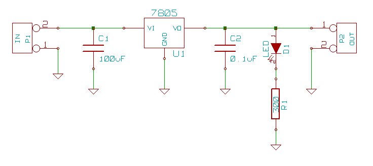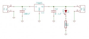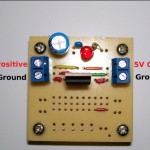 The LM7805 voltage regulator is a common solid state device that steps DC voltage down from voltages higher than 5v down to 5v DC. The great part about the 7805 is that it is very common and very cheap, about $1.50 at your local RadioShack (Part # 276-1770) and even cheaper online and in bulk (About 32¢). The 7805 is self contained and doesn’t require any peripheral components to work, just send 8v-40v to the input, connect ground and bingo, 5v at the output. While this direct wire method might work for some simple circuits, any significant circuit or high speed logic should have its Vcc source filtered to eliminate any noise and reduce voltage fluctuation. This how-to builds a Standalone Voltage Regulator with power filter capacitors. Also, what circuit is complete without a cool LED to show it is working. Our circuit will also have a “Power On” indicator LED. To round out the project, the entire circuit will be built on a pre-etched PCB available at almost any RadioShack, no wire-wrap, no etching, just building. Here we go.