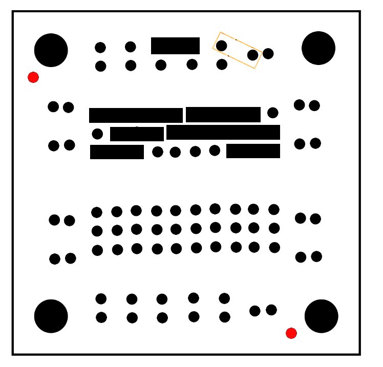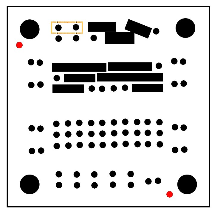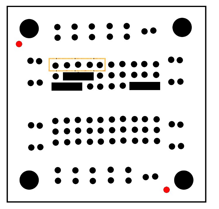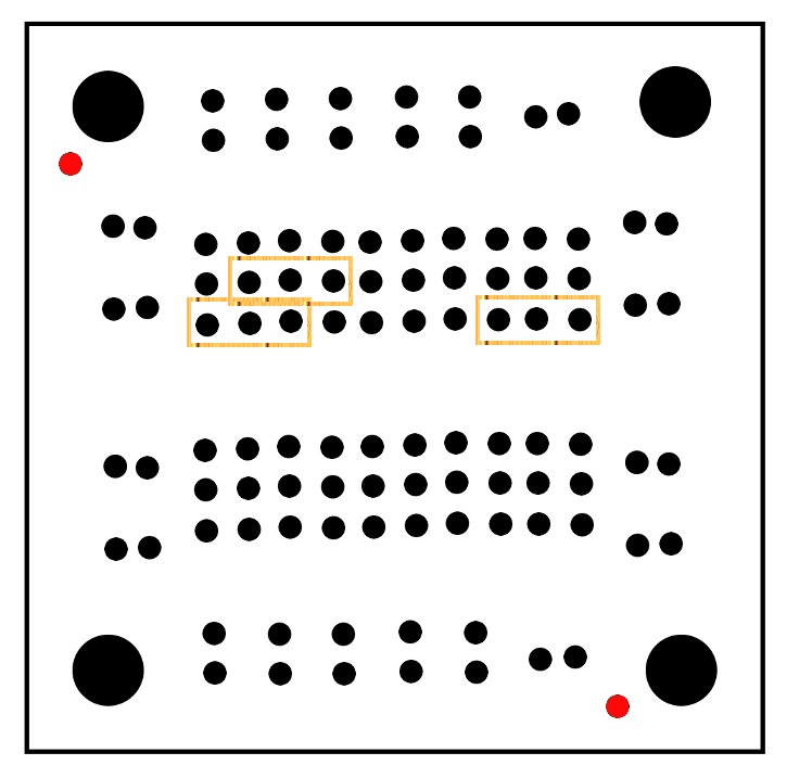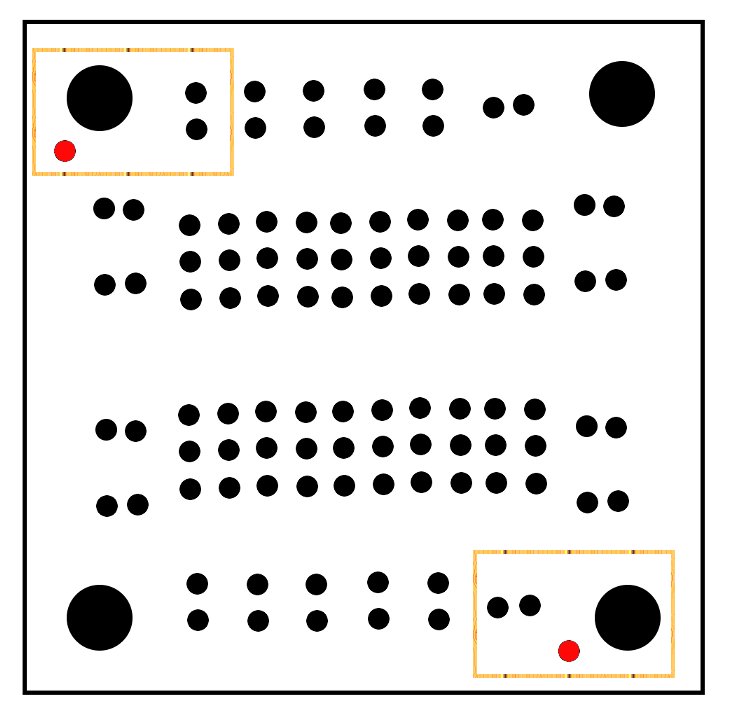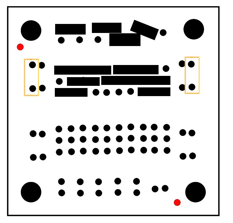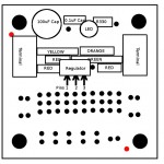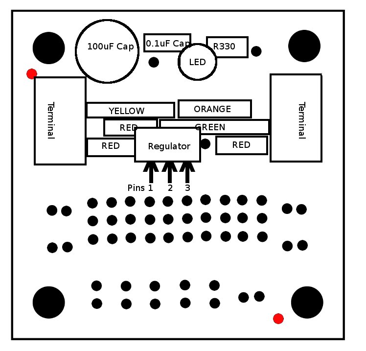 The regulator circuit will be built on one side of the single IC board, this leaves the other side for other simple circuits you might want.  The two sides of the the single IC board are almost mirrors of each other, but be careful, they are not mirrors, to build this project we first have to make sure the board is setup the correct way. The General-purpose IC board comes in a set of two, looking at one of the boards you should see a single small hole next to one of the larger mounting holes, we are going to use this hole as a key for our layout. If you line up the keyhole and other mounting holes with the image at right (Keyholes are in red) you will be able to build the circuit just as it appears in the assembly diagrams. Please take time to orient the board, if you don’t, the circuit will not work.