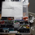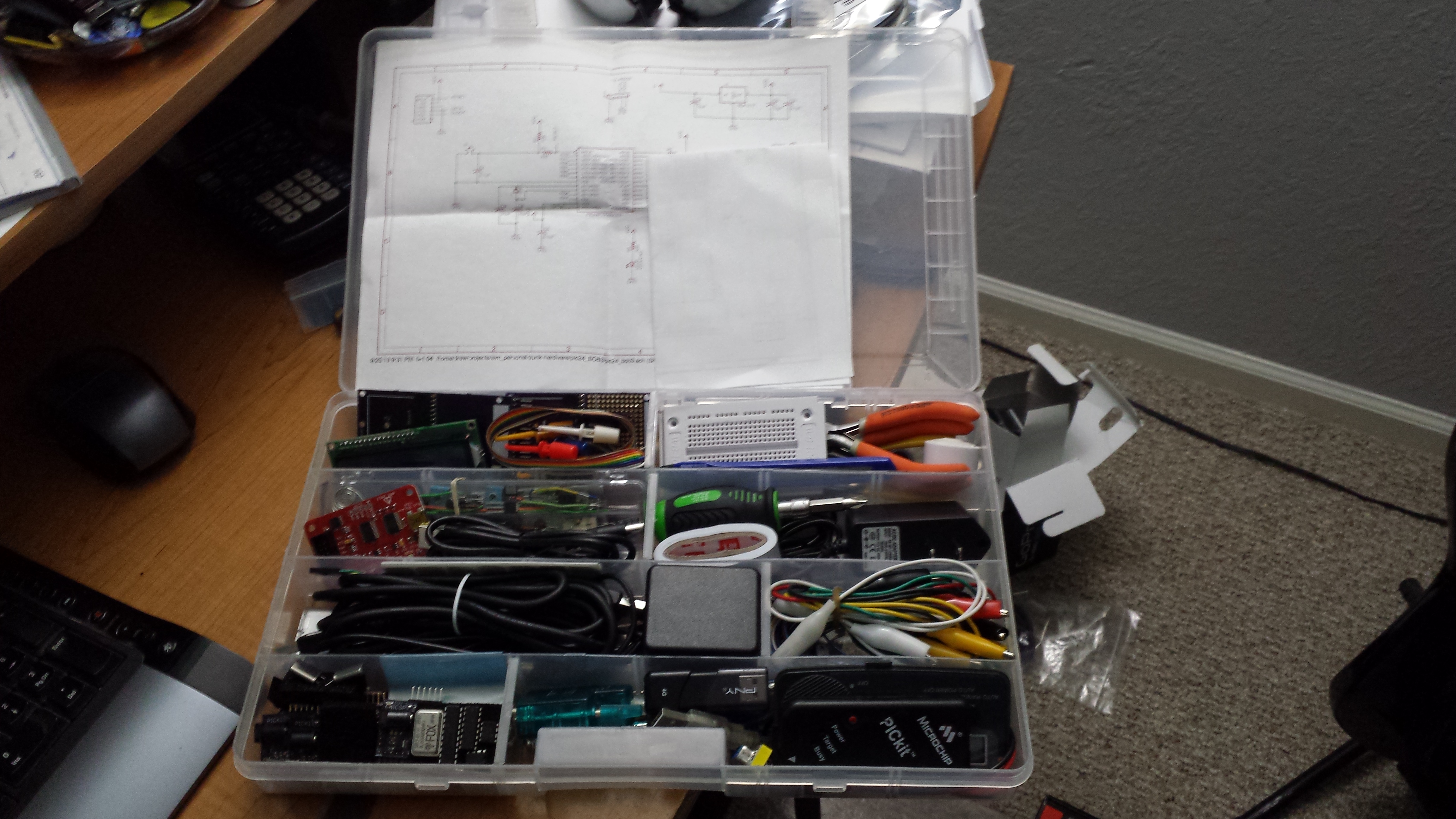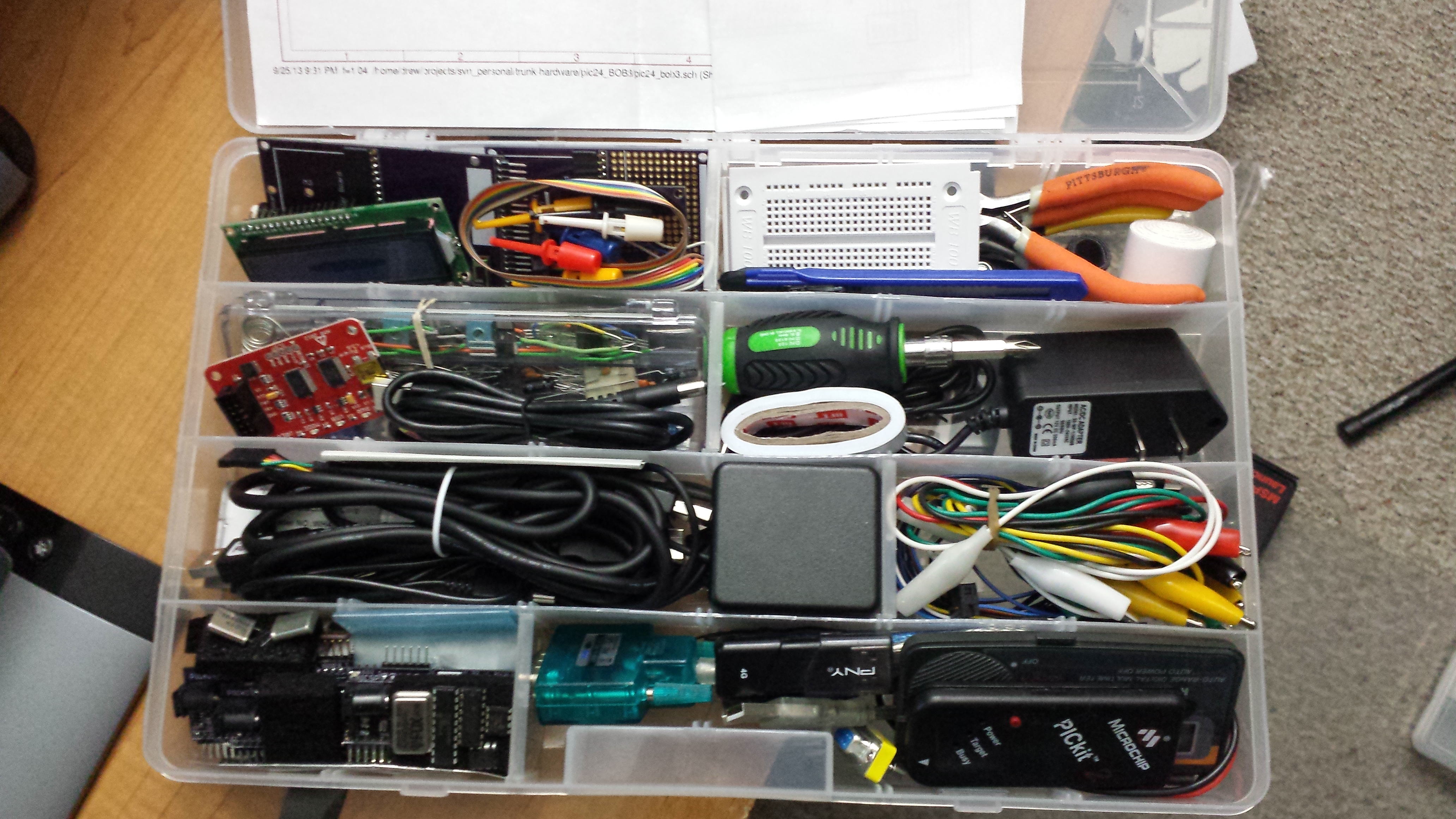 Lately I’ve been moving between 3 different locations and have been trying to do contracting work related to PIC processors. It was really frustrating to have all my development tools and components only at my home office when I was away so much. The solution was to add what I needed to one portable kit to take from location to location. My first attempt was a small plastic toolbox, but that was quickly filled and always seemed to be a mess. Next I tried a plastic shoebox from home depot for $0.99. This worked well since I could see everything that was in it, however it was a pain to carry around since there was no handle and it didn’t fit into a bag nicely. The solution I came up with was a plastic parts bin with moveable seperator walls, like you can find a Harbor Freight or Home Depot. With the movable walls, you can really cram a lot of stuff into them, I was impressed with everything that I got into the bin.