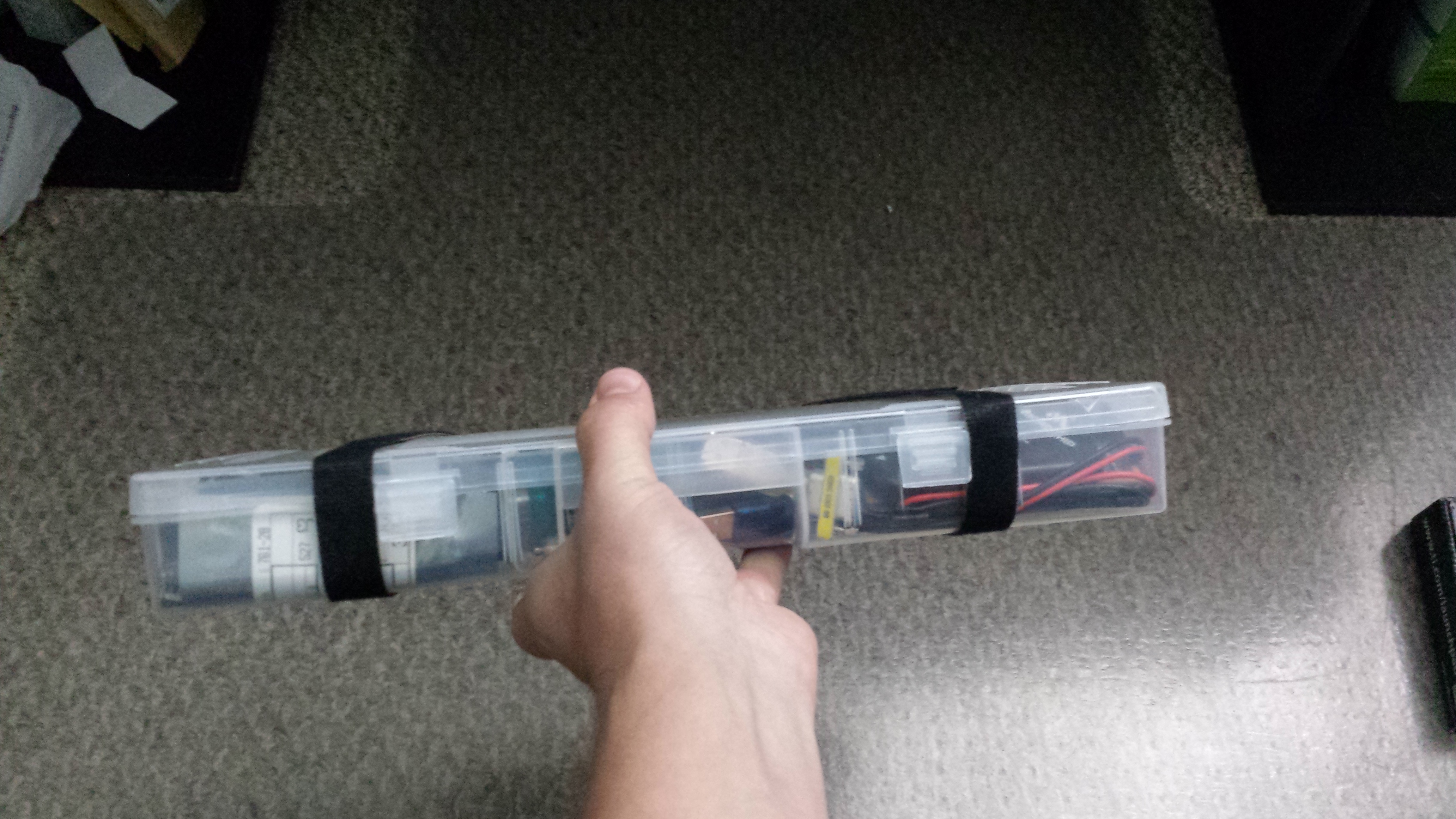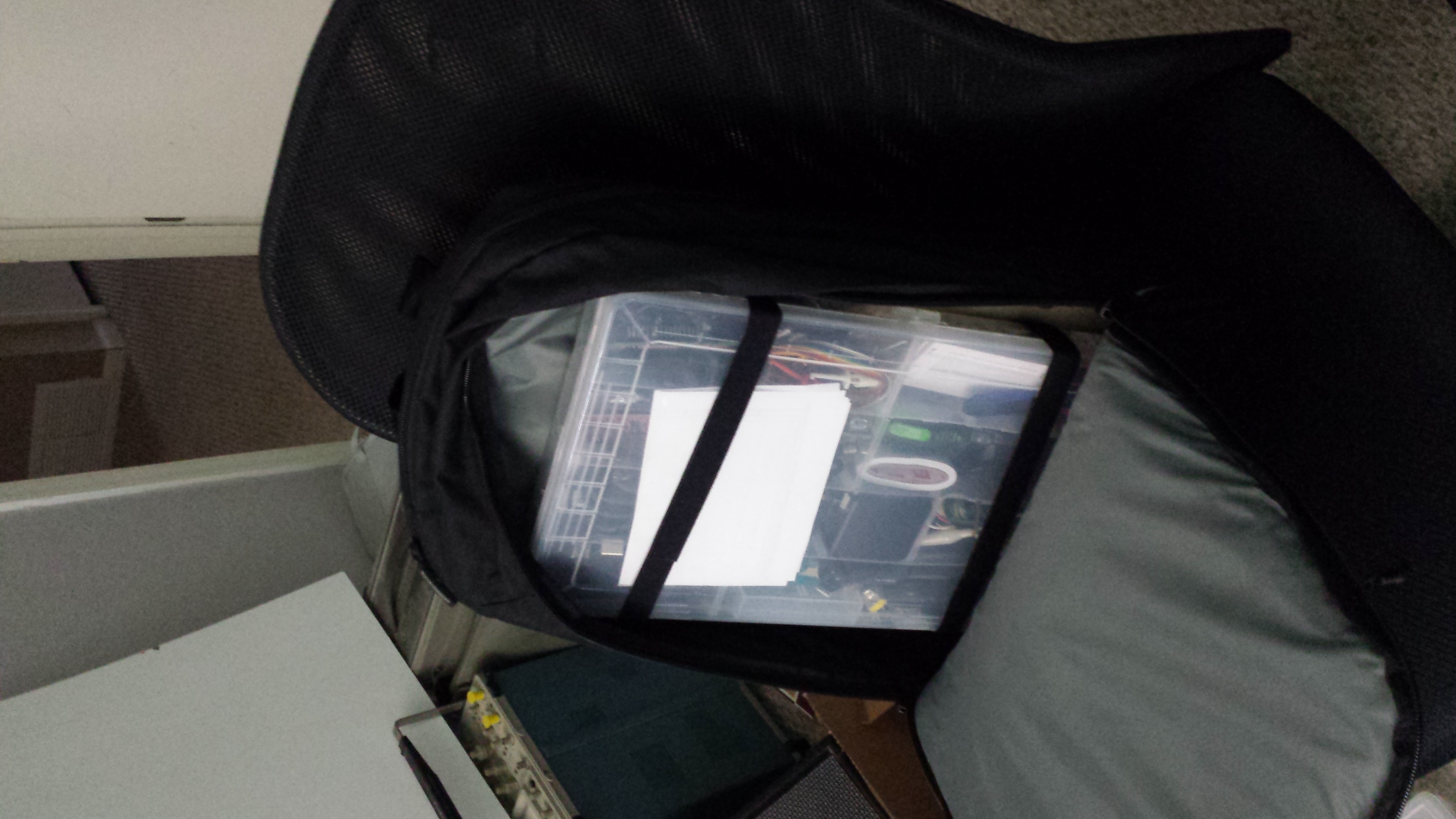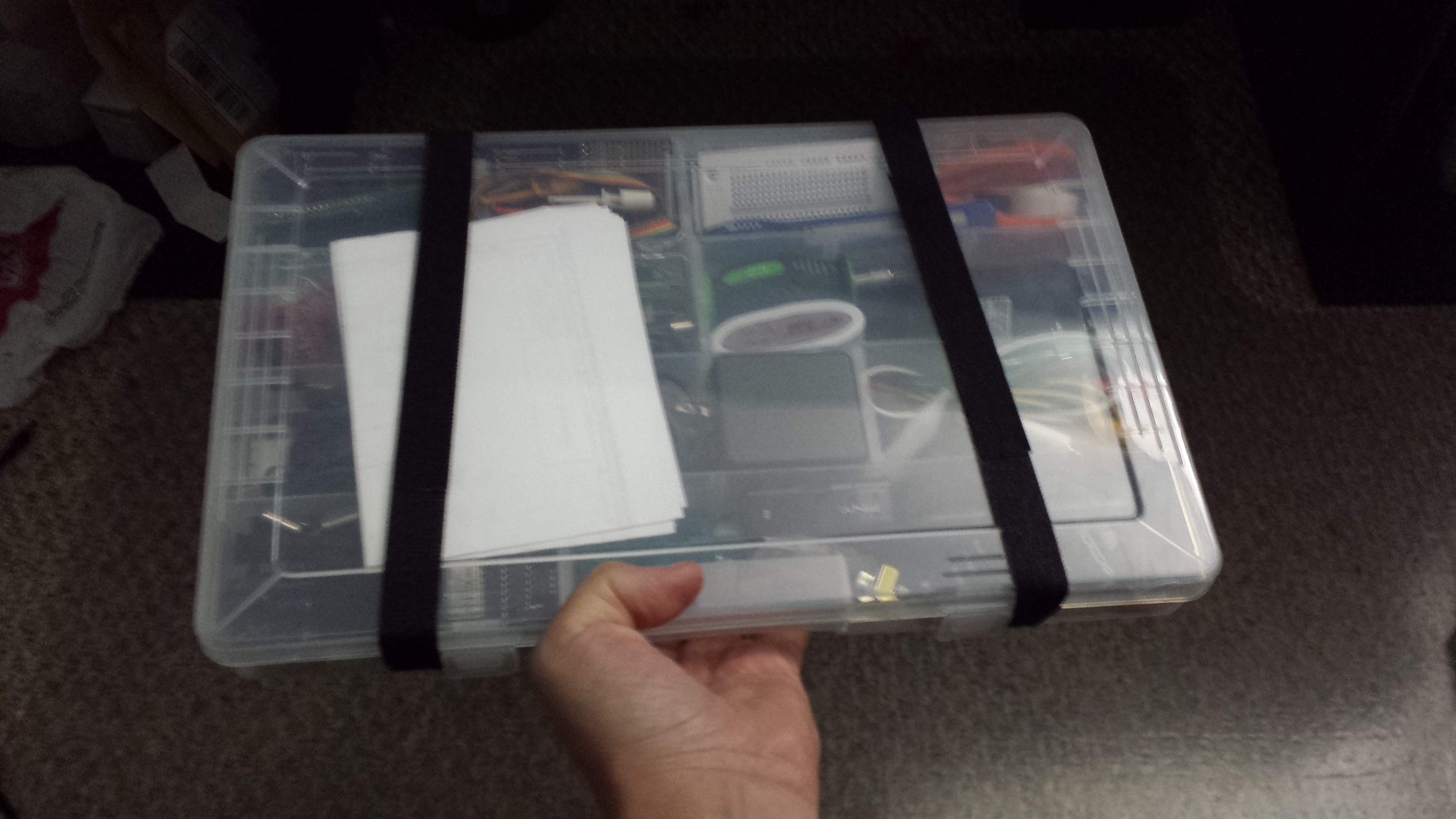 While the box does close and latch, I use two fabric hook and loop straps to make sure it stays closed. Â The unit is really compact and fits in any backpack or side bag. Â I do have a breadboard I take with me as well and I think I found a small plastic picture box that can hold that so I don’t crush components when it is in a bag. Â Here are some pictures too