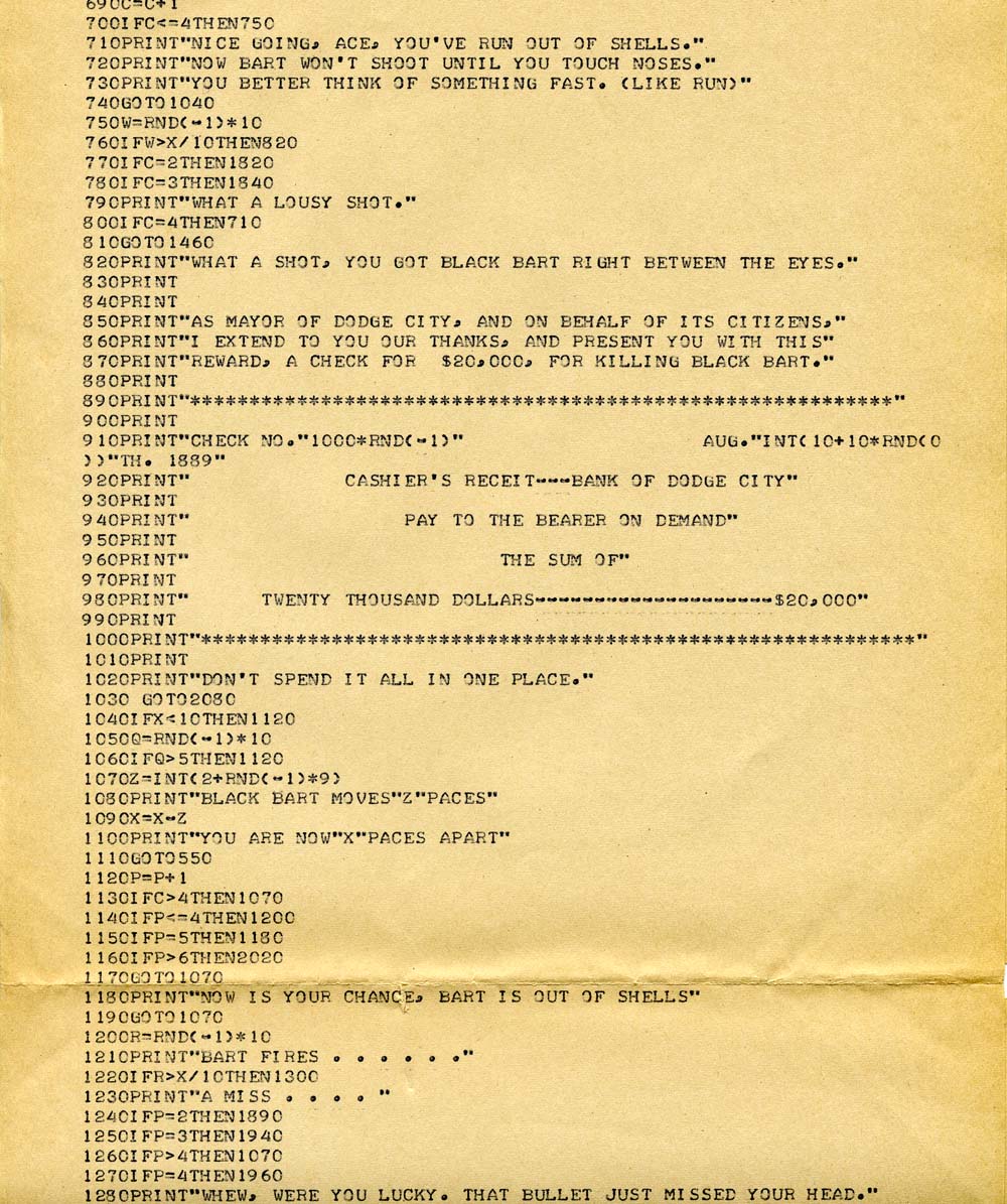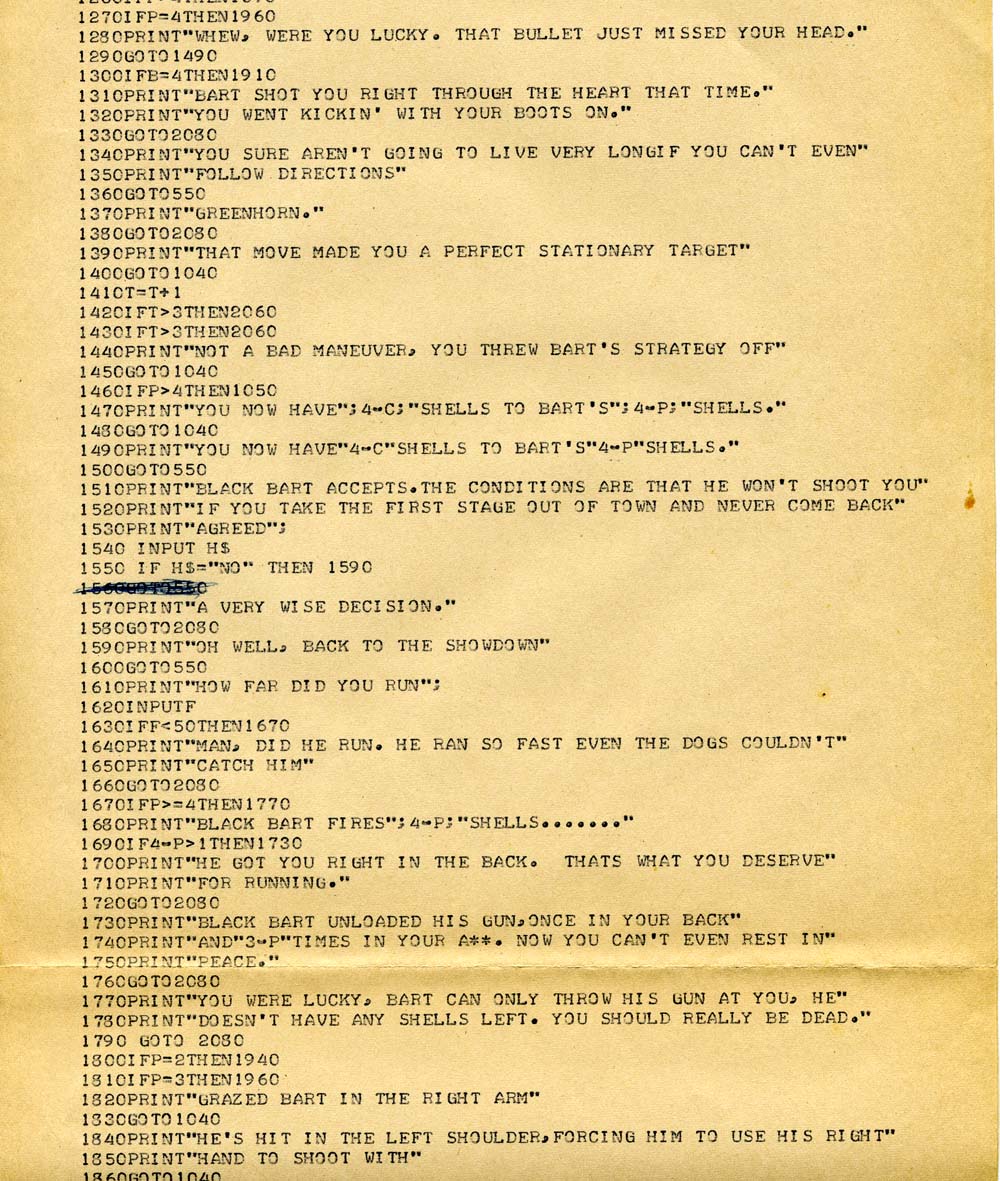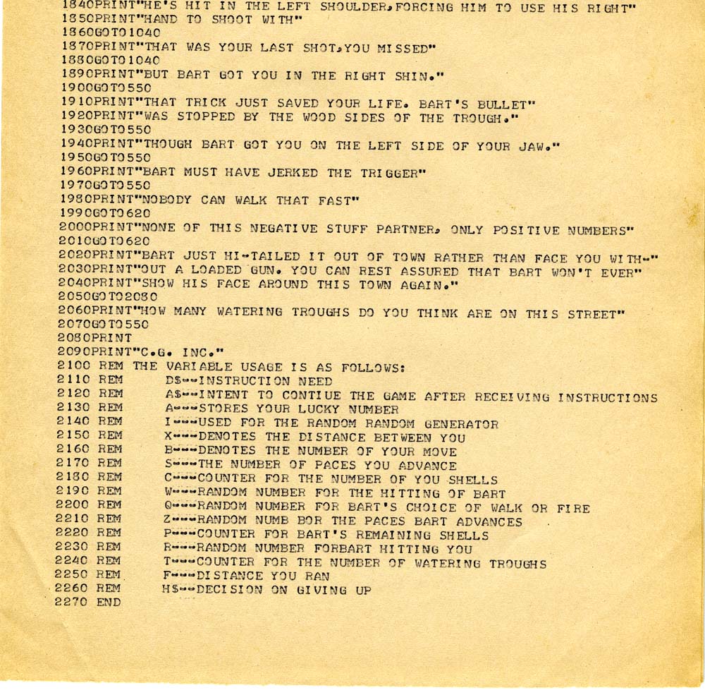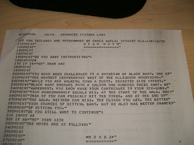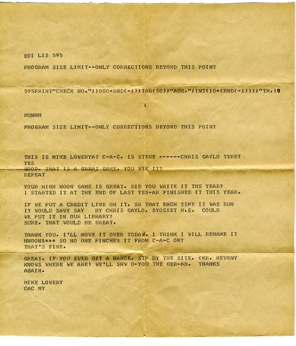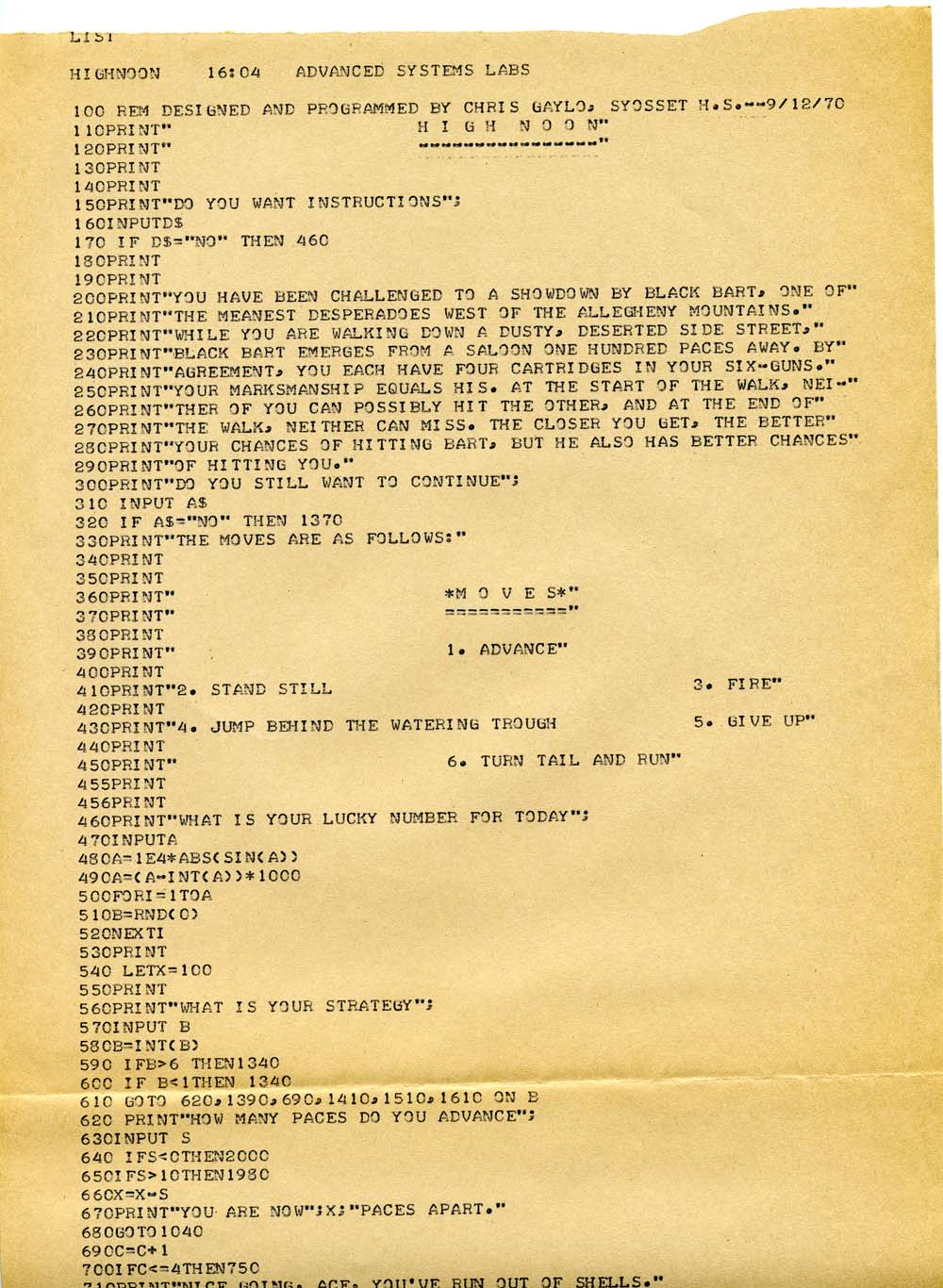 The creator recalls Highnoon was written on a timeshared system leased by Syosset High Scool from ‘Call-a-computer’ company (Later named Advanced Systems Labs) on Long Island, NY. The program is written in early BASIC and is less than 4 pages printed out. Development was all done via teletype terminal dialed into the server with a maximum user storage of 6.4K. Due to the limited persistent storage, other programs including Highnoon were transfered to paper punch tape off the mainframe. The author still has a copy of the binary program file and an ASCII print out of the code.